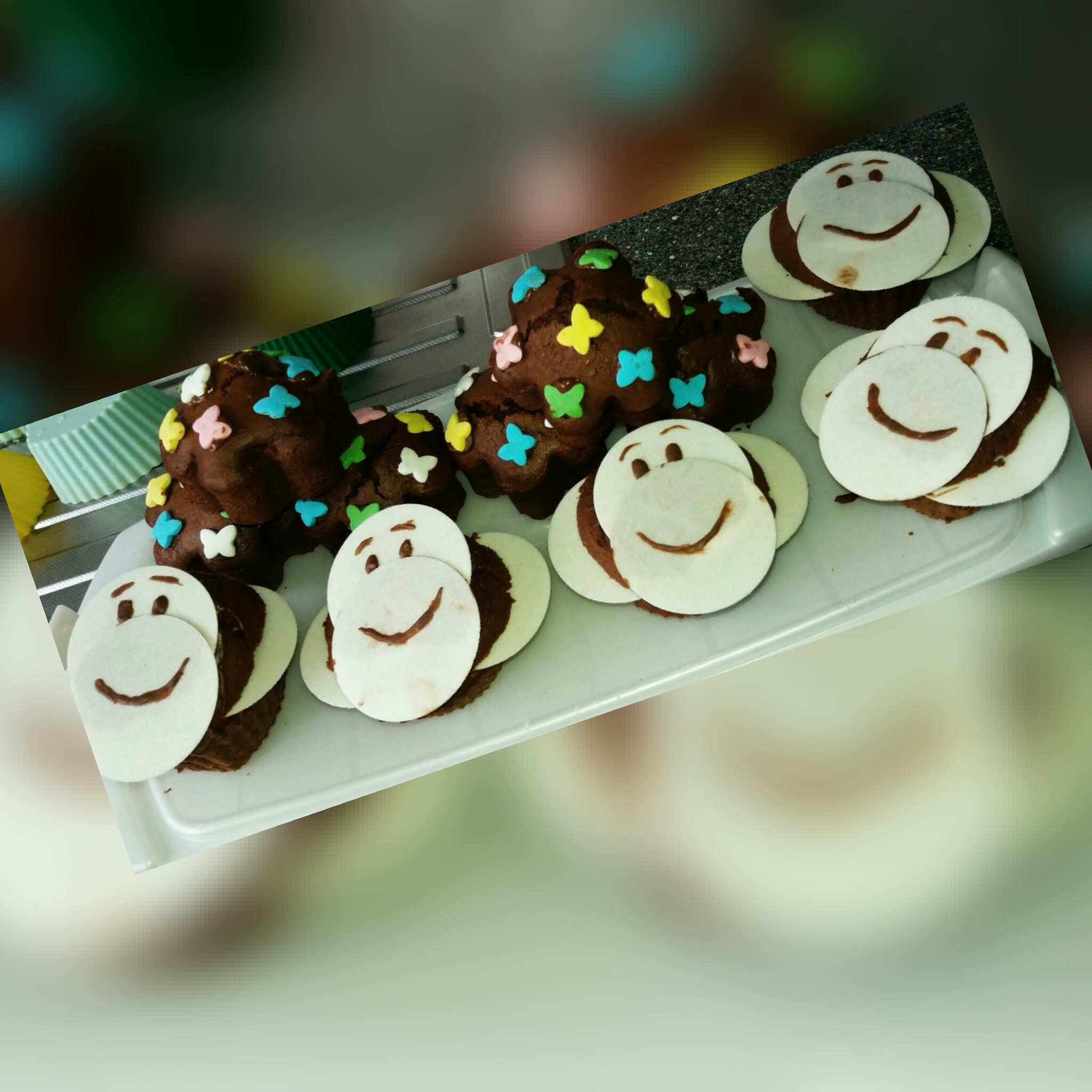 Diese kleinen süssen Äffchen hat meine Tochter für ihren Sohn für den Geburtstag iM Kindergarten  aus Muffins und Oblaten gezaubert